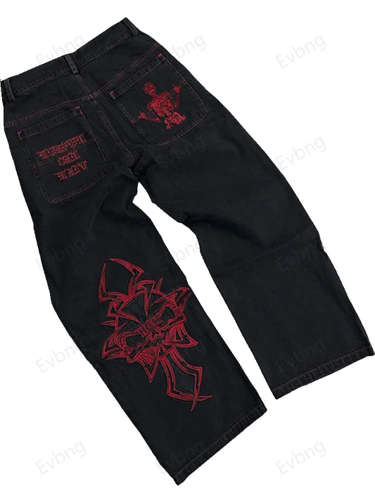 Hip Hop Y2K Jeans Mens Retro Skull Embroidery Washed Women's Denim Pants New Straight Casual Loose Wide Leg Trouser Streetwear
